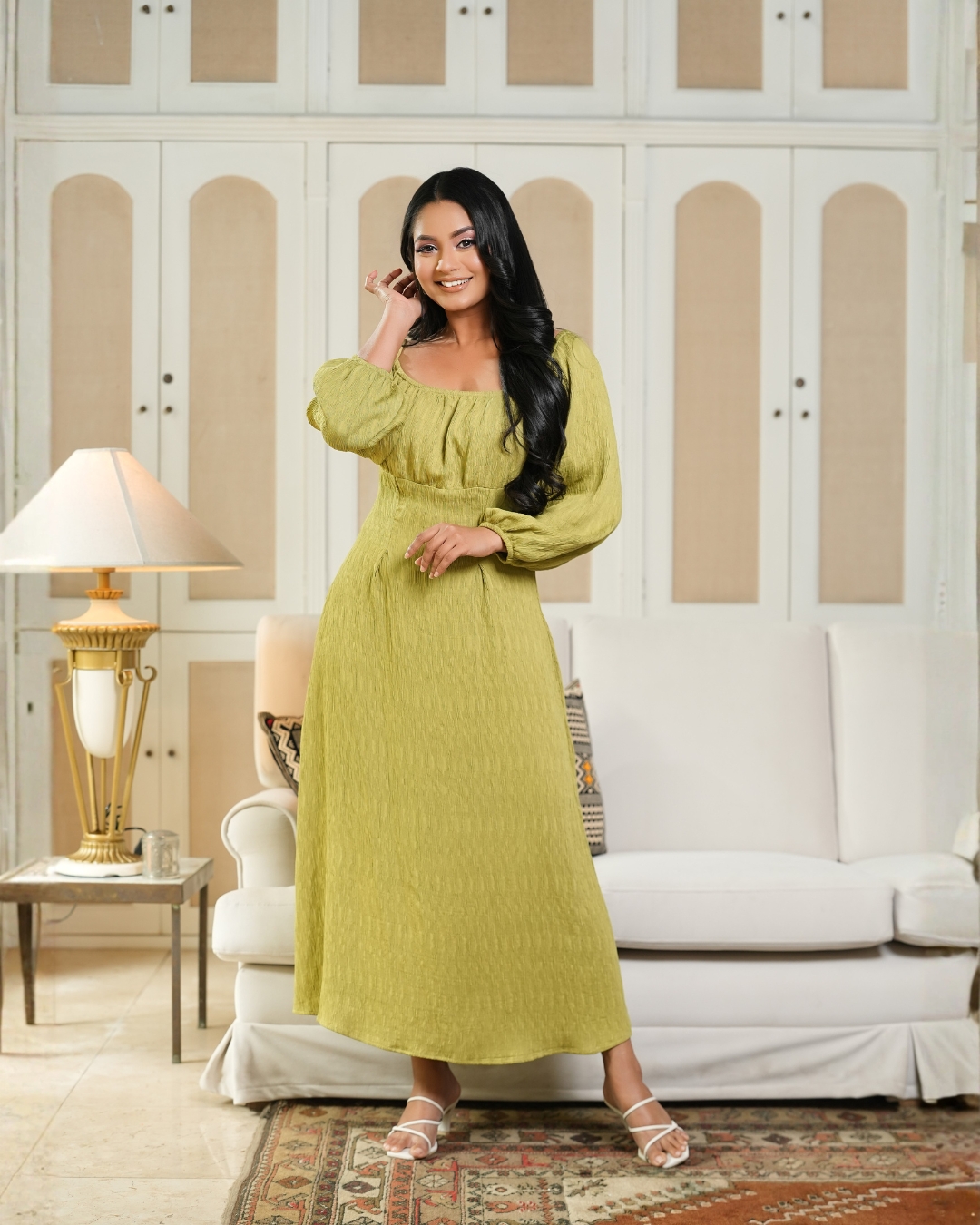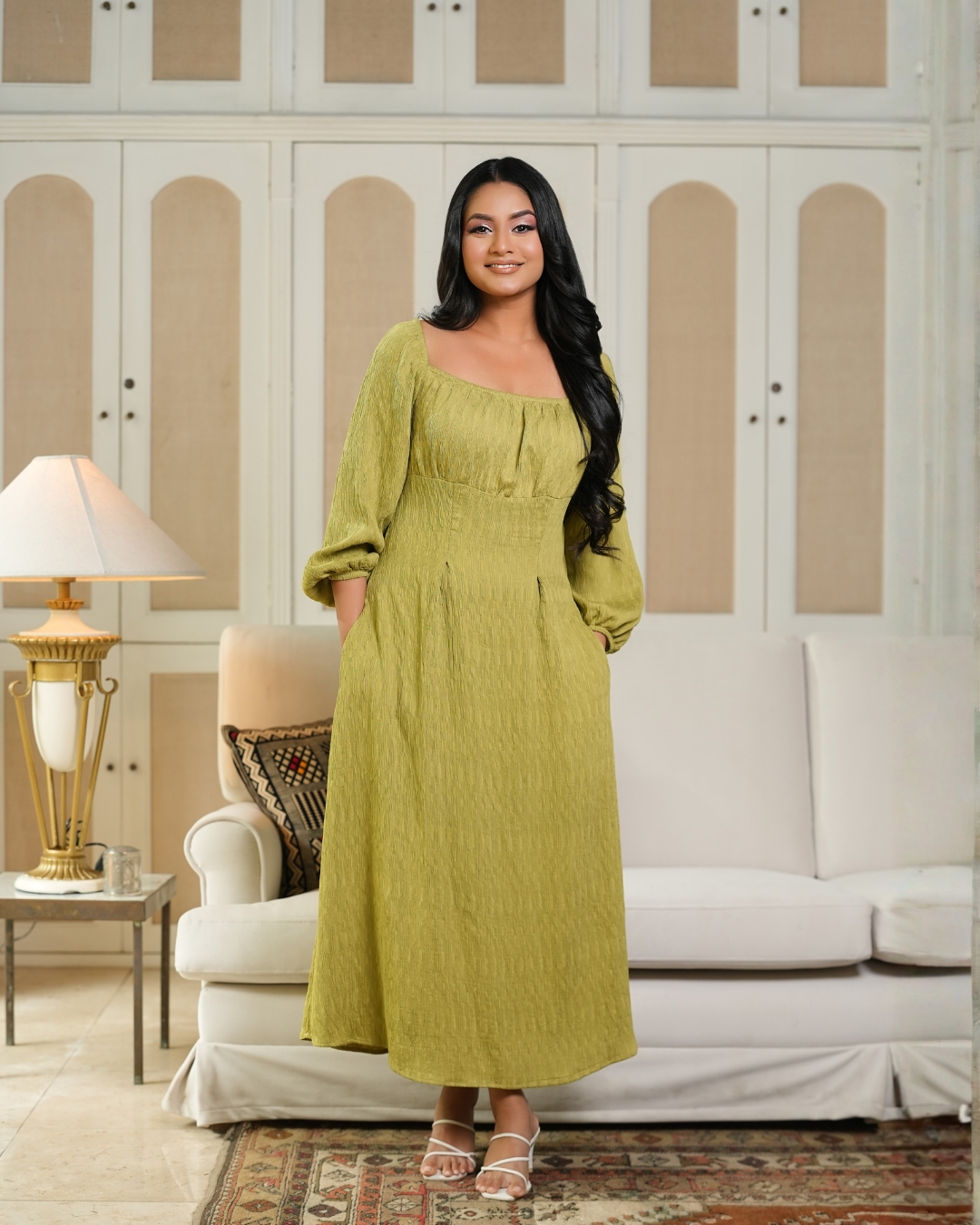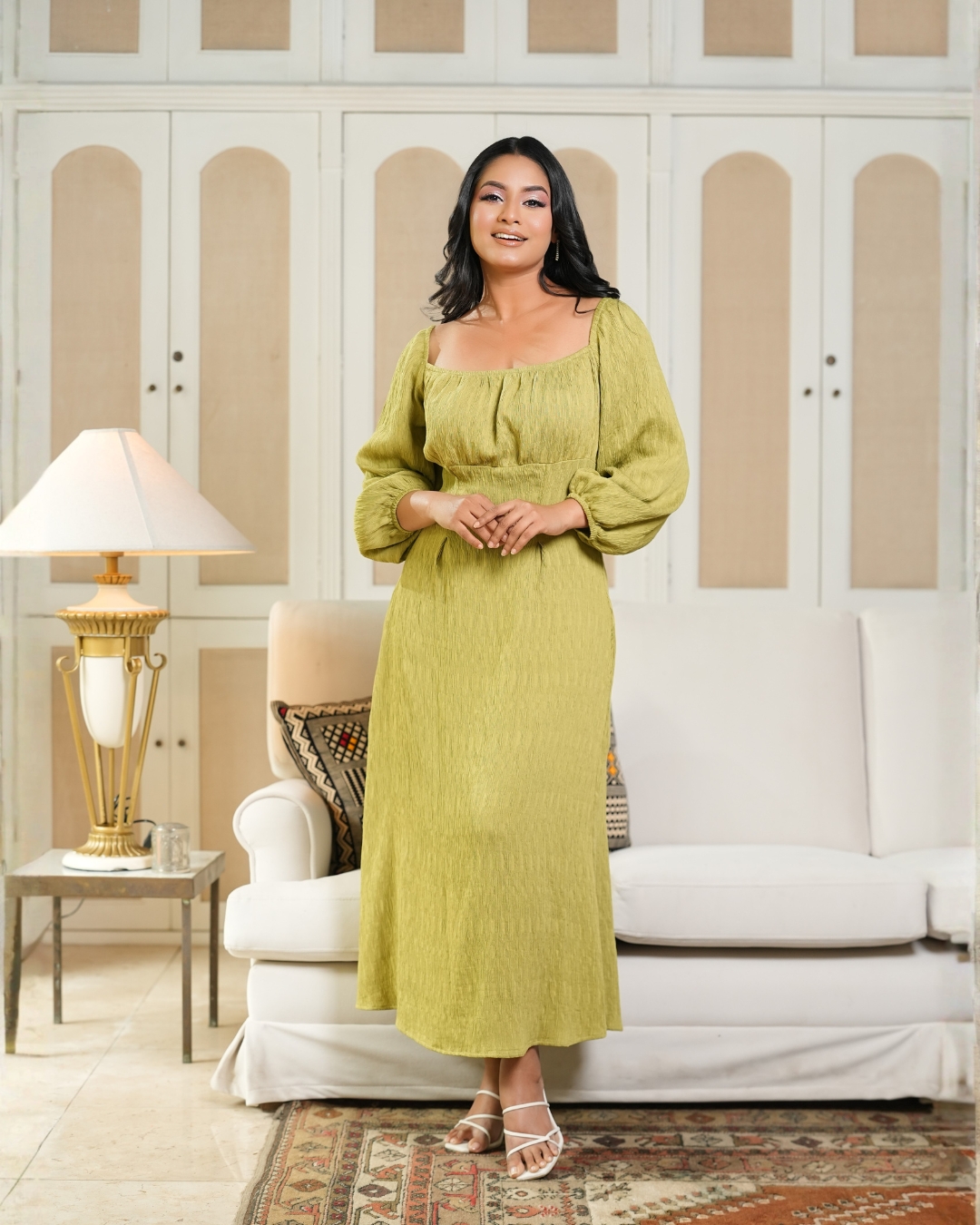 Back Cord Tie-Up Detail Puff Sleeve Midi Dress