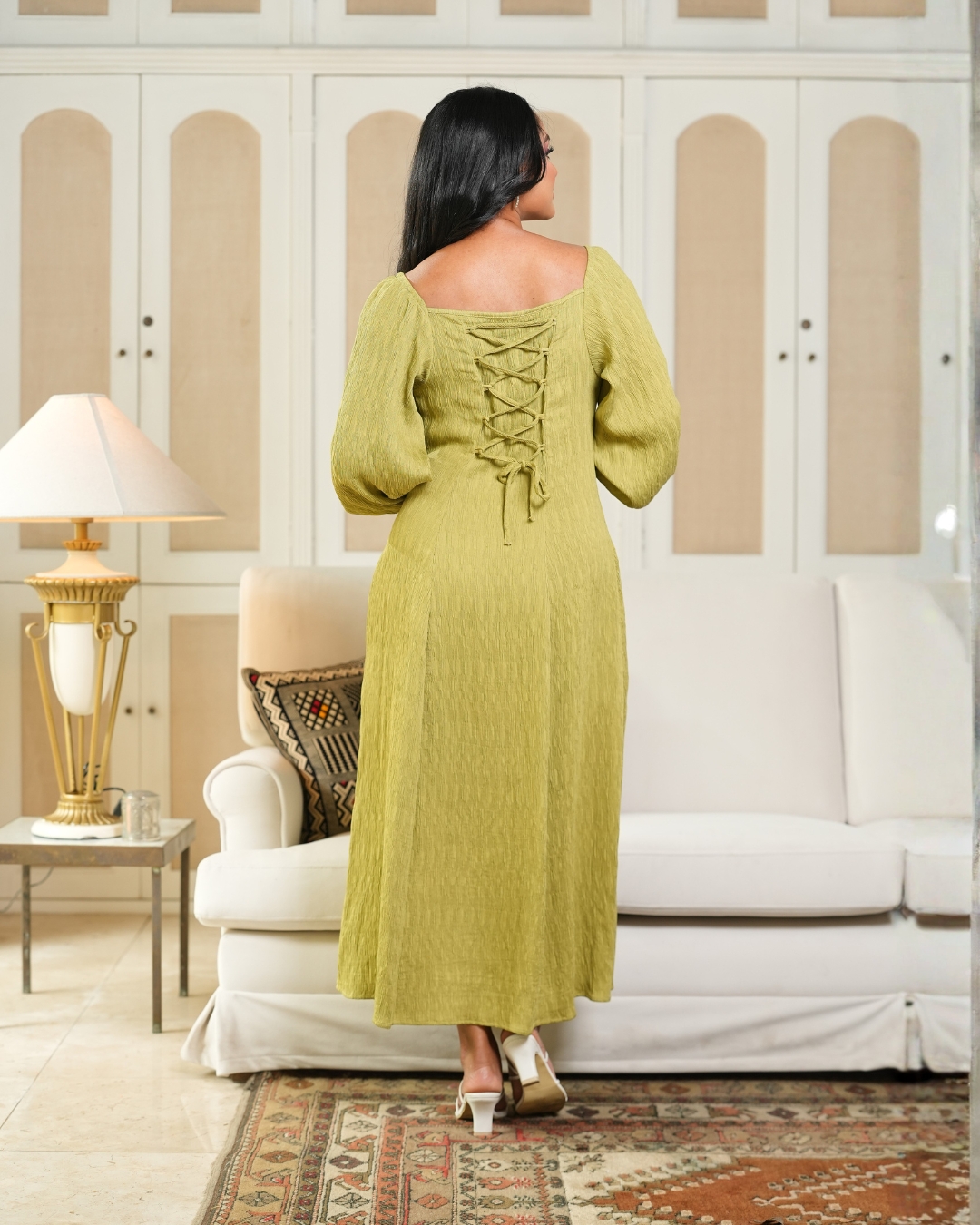 Back Cord Tie-Up Detail Puff Sleeve Midi Dress
