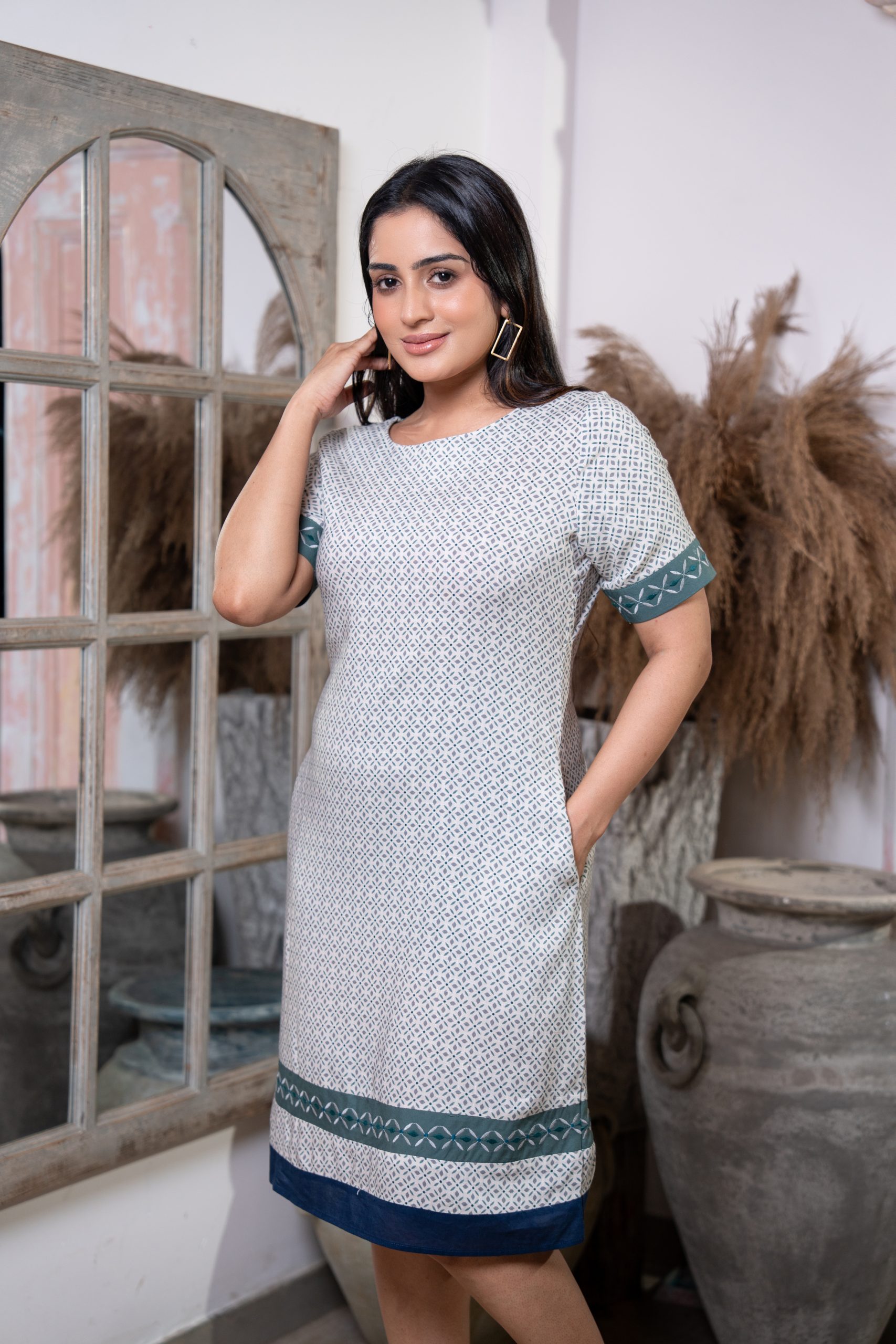 - Eye-Catching Geometric Floral Print blended with Chic Color Block Detailing