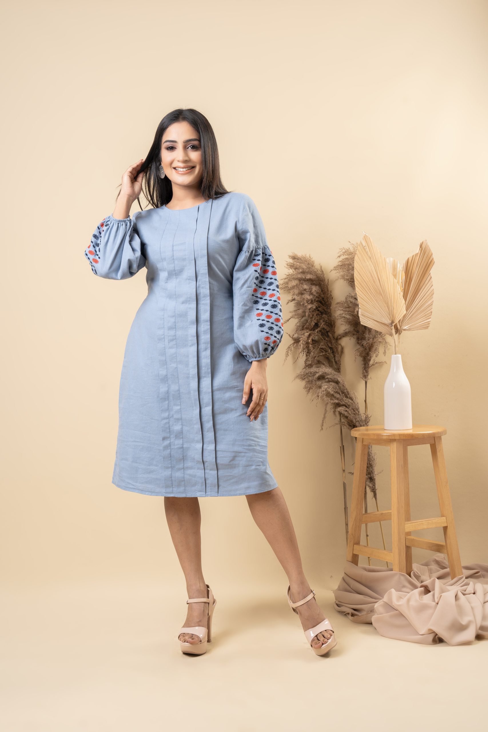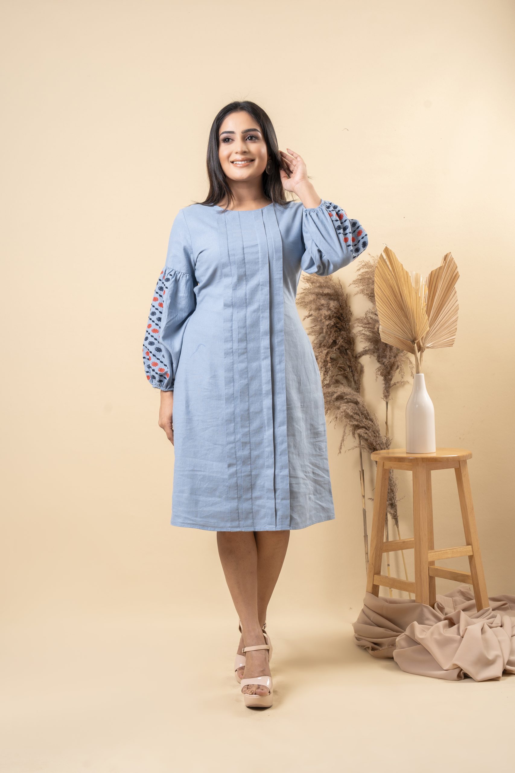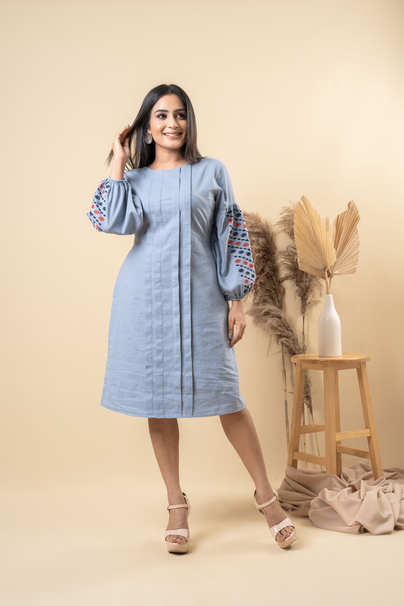 - Soft Feel Sleeve Embroidered Dress