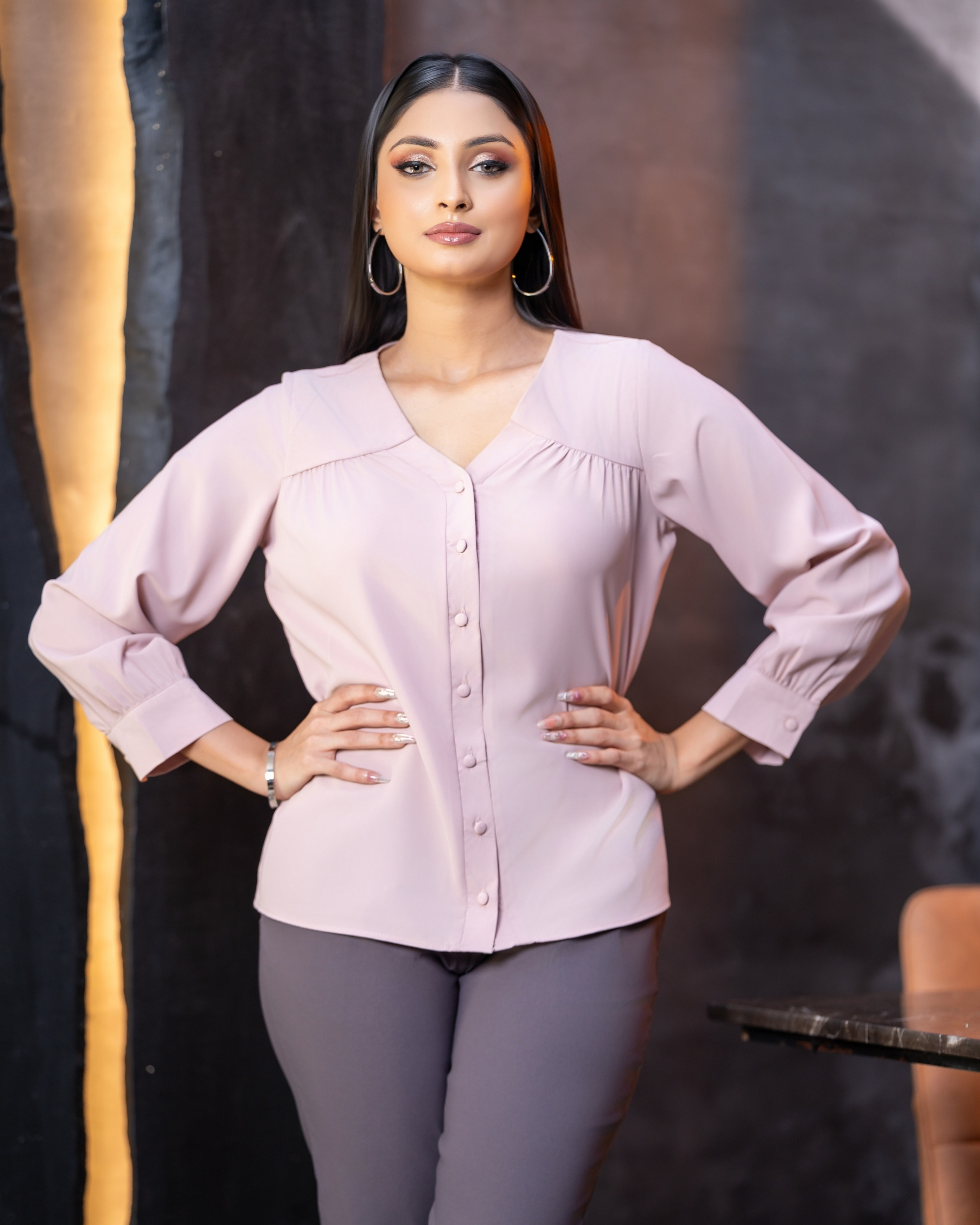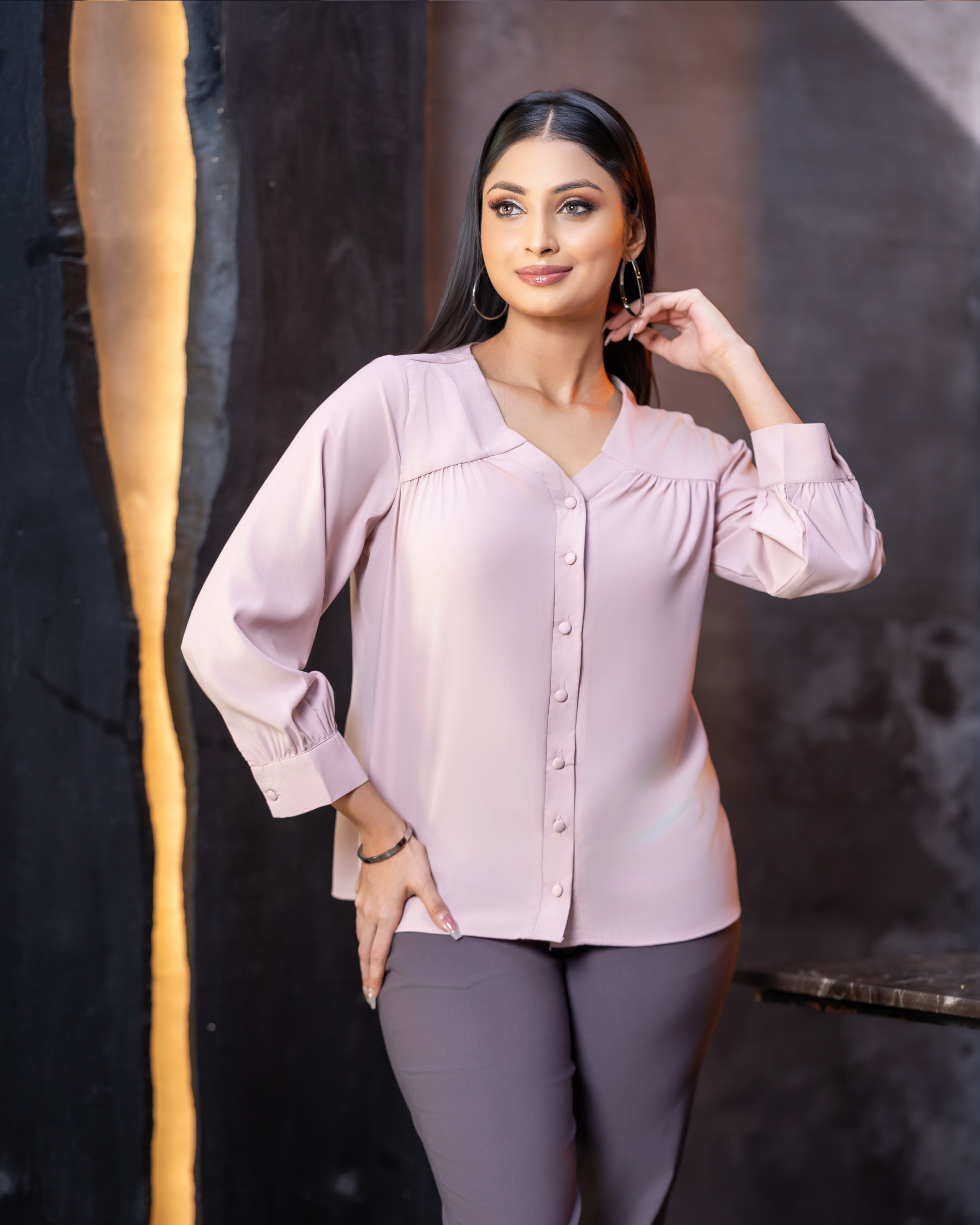 V-Neck Front Yoke Gathered Button-down Top